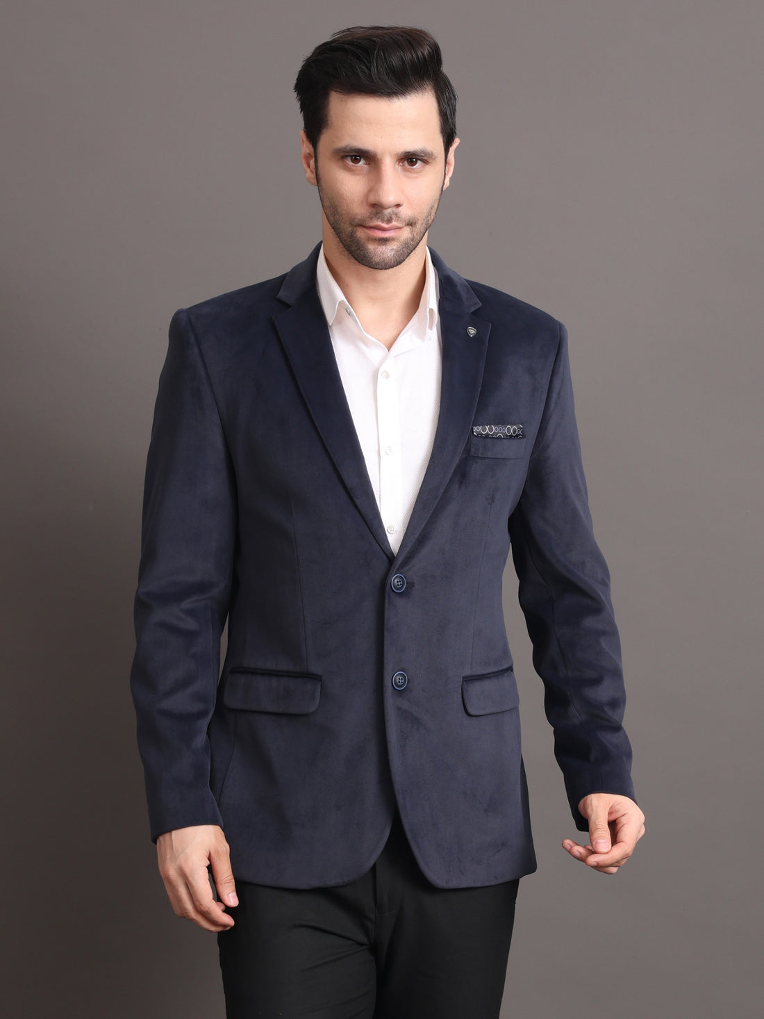 Men's Navy Blue Solid Velvet Tailored Fit Blazer