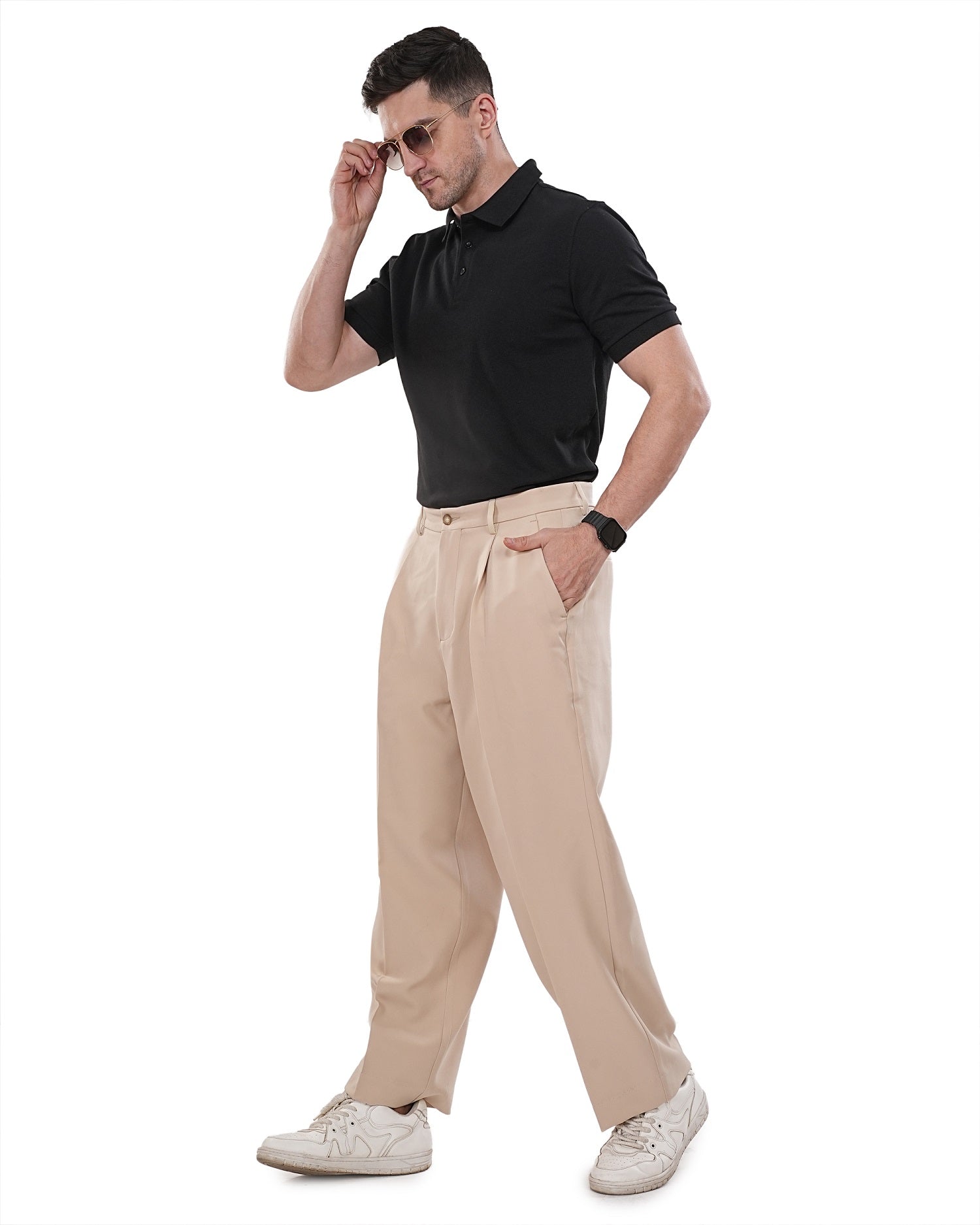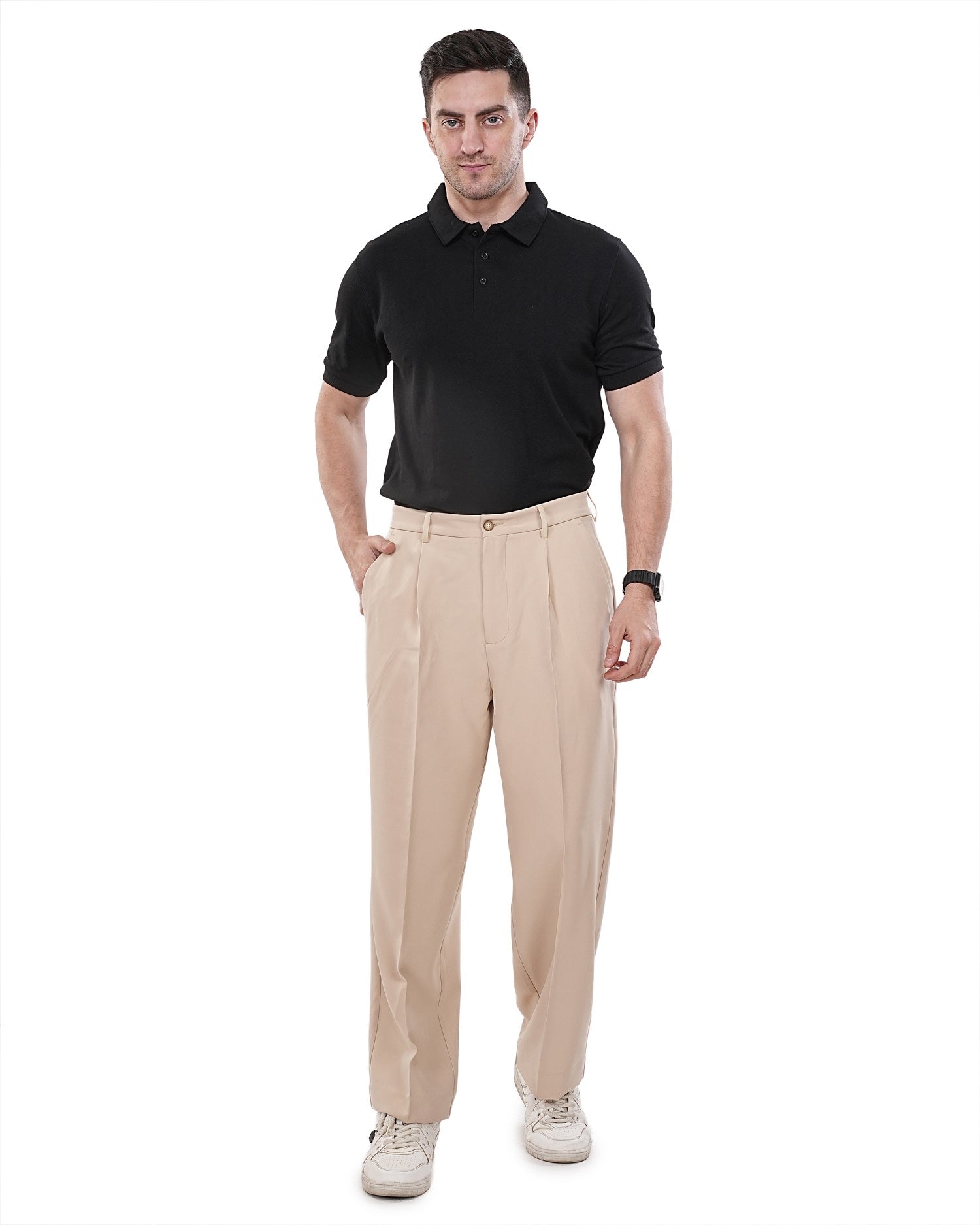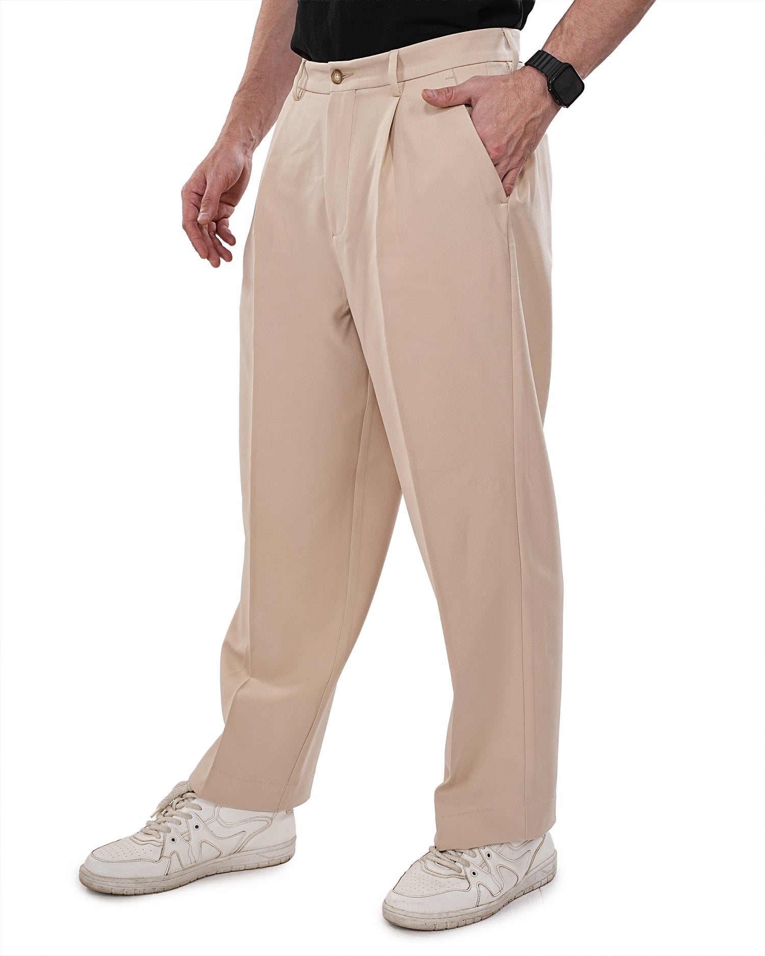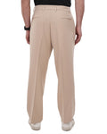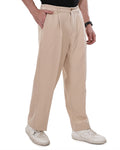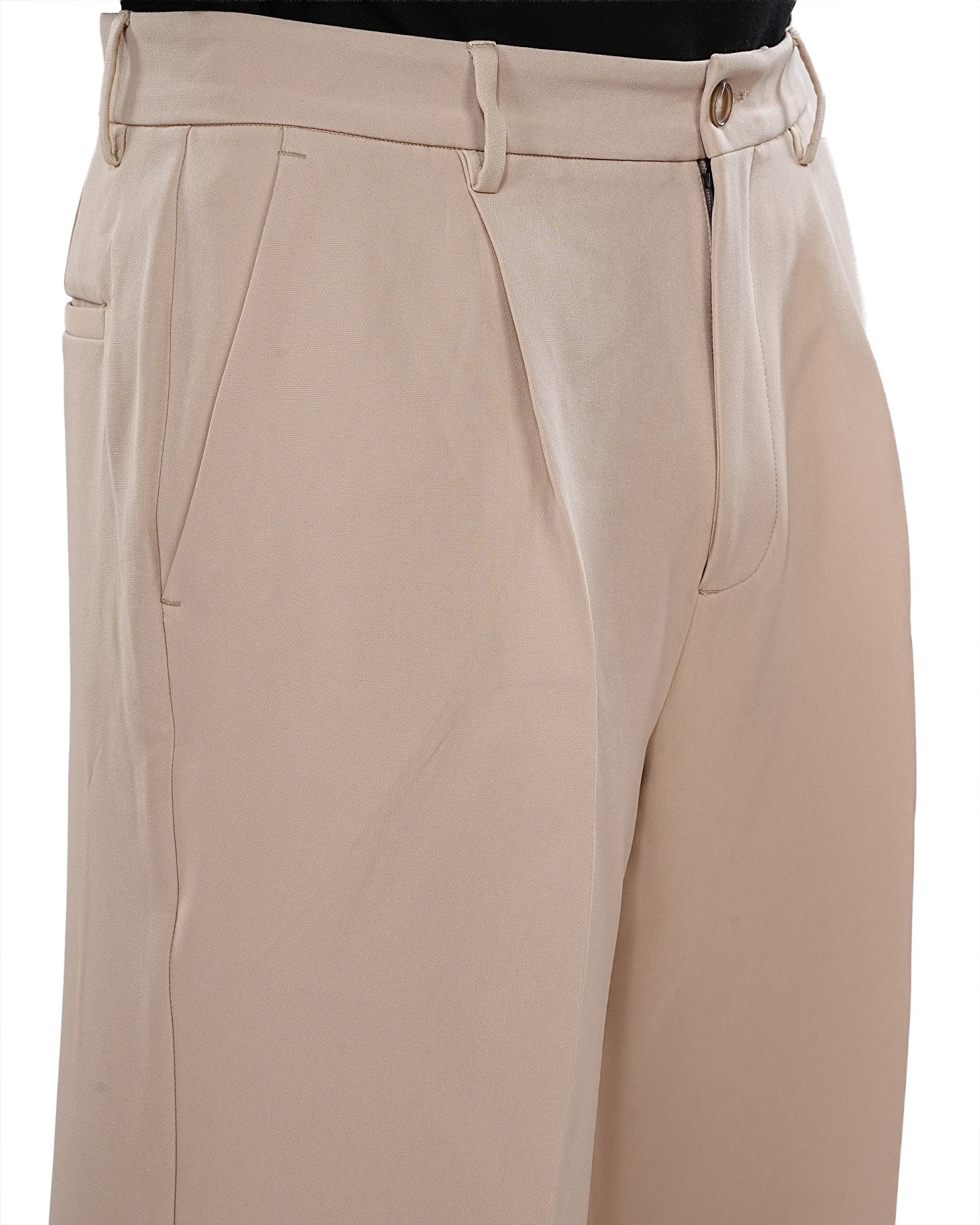 Men Beige Solid Mid Rise Pleated Casual Korean Trouser Has a Mid Rise, Front Pleated, Two Back Pocket and Two Side Pocket, Button Closure, Zipper Fly and Banana Crepe Fabric.